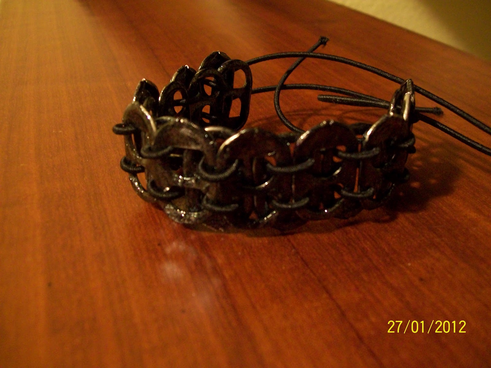 Estan de moda;asi que le hice esta pulsera para una amiga.De momento es la primera que hago,no esta nada mal,verdad?Hay infinitos modelos.Este en concreto,hay que pintar las anillas.En algunas tiendas las venden pintadas;pero si quieres un color en particular,no te queda otro remedio que pintar.Merece la pena hacerlas.Seguiré poniendo más entradas con cosinas nuevas.Un saludo